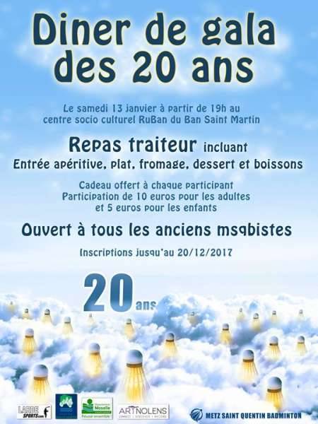Le 13 Janvier 2018, à partir de 19h, le MSQB (Metz Saint-Quentin Badminton) fête ses 20 ans !!!