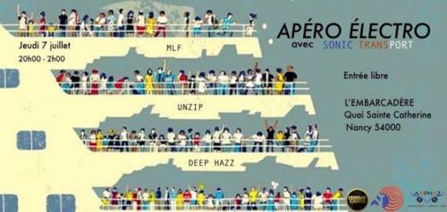Jeudi 07 Juillet avec un départ sur la terrasse de la péniche l’Embarcadere à 20H00 , Sonic Transport et ses artistes Deep Hazz , Ben Unzip et MLF arrêtent le temps pour un voyage éléctronique coloré et rytmé , de quoi accompagner vos planches apéros, pizzas , mojitos et autres breuvages préparés avec amour par la team du Club ; Dés 23H00 on envahit le bar du club et on monte le son , caliente jusqu’à 02h00 !!!