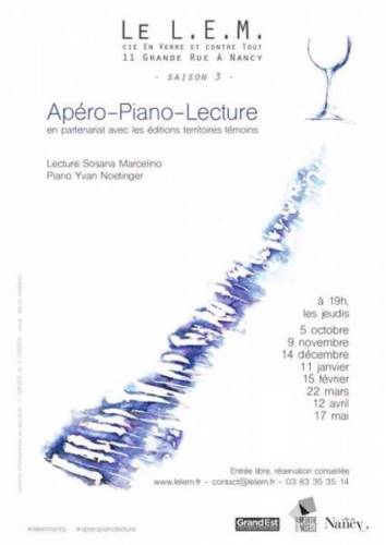 Le LEM et les Editions Territoires Témoins vous proposent un jeudi par mois des Apéros Piano Lecture, un moment festif littéraire et musical à savourer entre amis.