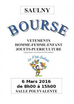Retrouvez l’association "Les P’tits Saulniots", ce dimanche 6 mars 2016, à la salle polyvalente de SAULNY , pour leur bourse aux vêtements hommes femmes enfants, aux jouets et à la puériculture, avec pas moins de 70 exposants.