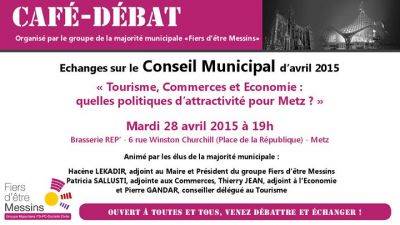 Dans le cadre du prochain Conseil Municipal du mois d’avril, le groupe Fiers D’être Messins vous invite à participer, échanger et débattre lors de notre prochain café-débat consacré aux politiques d’attractivité de Metz (tourisme, commerces et économie) et animé par nos adjoints et délégués, Hacène LEKADIR (Président du groupe), Patricia SALLUSTI (Adjointe aux commerces), Thierry JEAN (Adjoint à l’économie) et Pierre GANDAR (conseiller délégué au Tourisme).