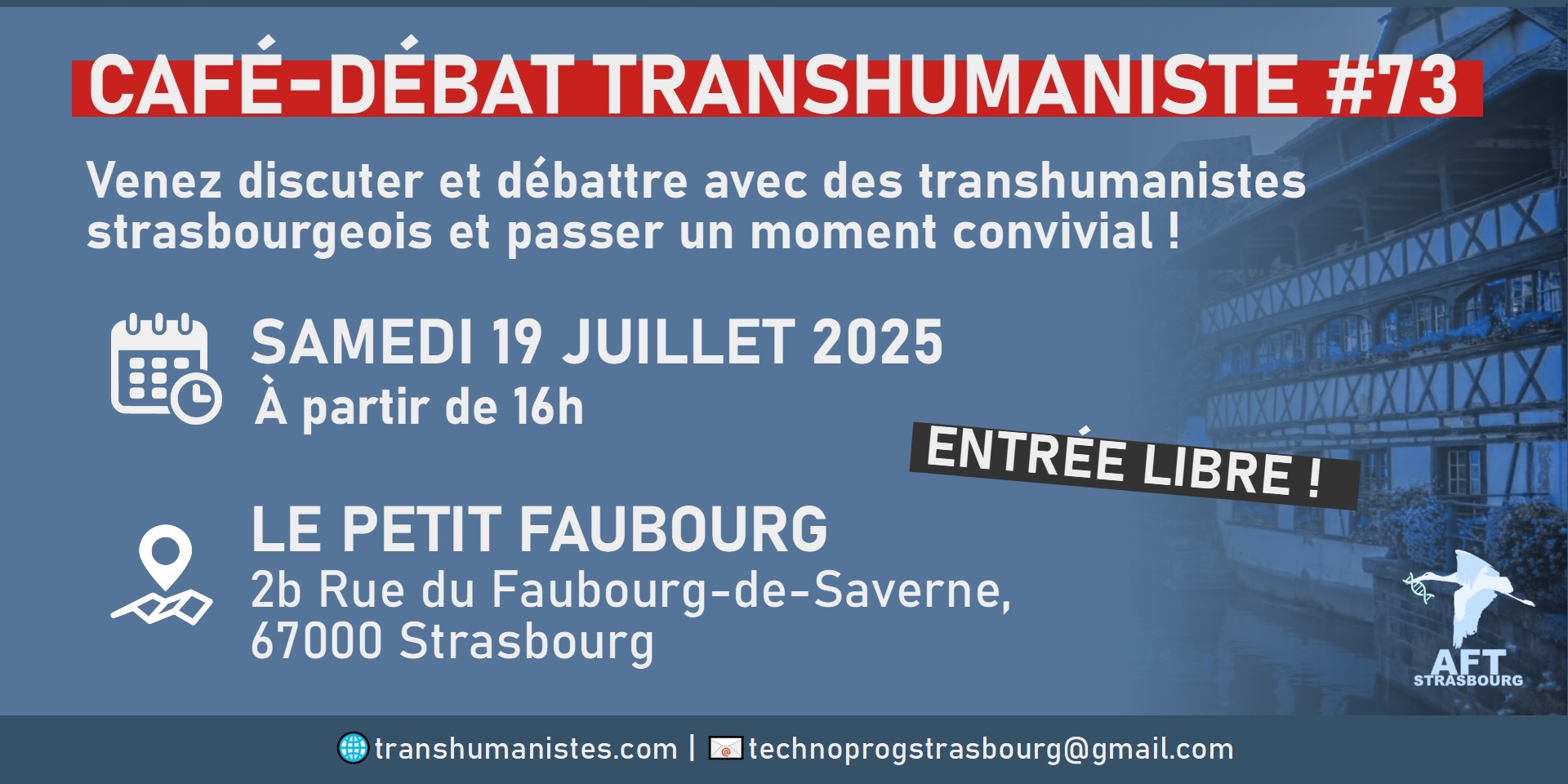 Vous nous trouverez à côté du roll-up aux couleurs de l’AFT Technoprog. L’accès se fait par la porte donnant directement sur la rue, à gauche du restaurant => https://transhumanistes.com/wp-content/uploads/2025/03/AFT67_petit_faubourg.jpg