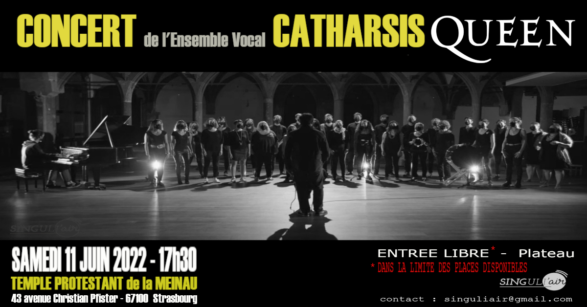 L'Ensemble Vocal CATHARSIS QUEEN vous donne rendez-vous le samedi 11 juin , à 17h30, au Temple Protestant de la Meinau - 43 avenue Christian Pfister - pour un concert entièrement consacré au répertoire du groupe QUEEN.