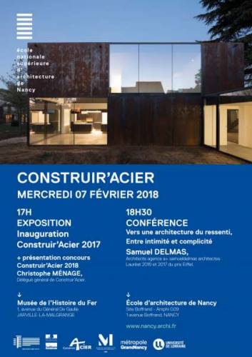 Samuel Delmas, architecte lauréat du Trophée Eiffel, donnera une conférence à l’école d’architecture de Nancy (1 avenue de Boffrand, 54000 Nancy) le 07 février à 18h30 sur la thématique « Vers une architecture du ressenti, Entre intimité et complicité ».