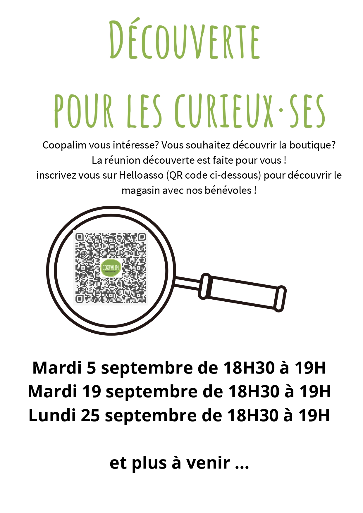 Coopalim vous intéresse ? Vous êtes curieux·ses d'en savoir plus ? La réunion de découverte est ce qu'il vous faut ! Venez découvrir le magasin avec nos bénévoles! Il est possible de venir visiter le magasin en dehors des sessions de découvertes, avec ou sans masque, aux horaires d'ouverture indiqués sur la page facebook de Coopalim (visible sans compte Facebook): https://fr-fr.facebook.com/coopalim.strasbourg/