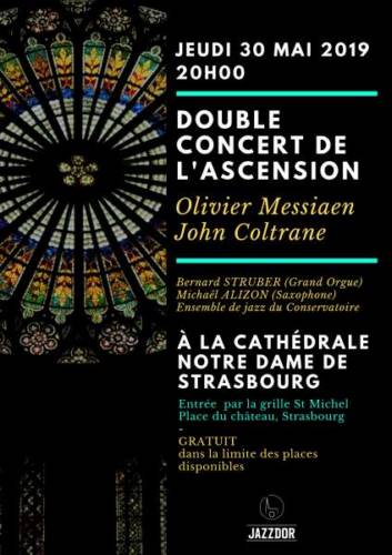 Jeudi 30 mai sera l’occasion d’un double concert présenté à la Cathédrale Notre-Dame de Strasbourg et associant l’oeuvre d’ Olivier Messiaen ”l’Ascension”, composée en 1933, avec une deuxième ”Ascension”, celle du saxophoniste américain John Coltrane, composé elle en 1965.