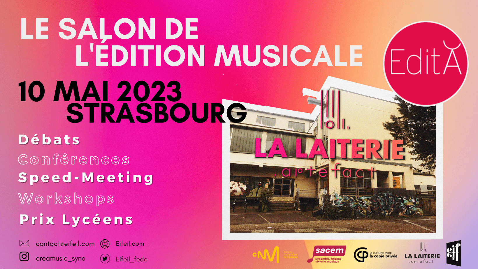 Chaque année la fédération EIFEIL (éditeurs de musique indépendants fédérés en France) organise EditA, Le salon de l'édition musicale revient pour sa neuvième édition le 10 Mai 2023 et pose ses valises à La Laiterie à Strasbourg !