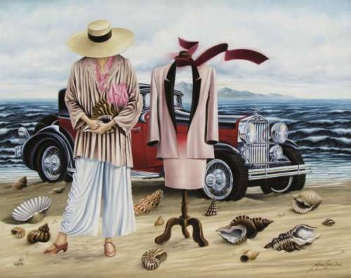 C’est à l’évidence dans la filiation surréaliste que s’inscrit son travail, où l’on reconnaîtra quelques hommages et tributs rendus aux œuvres de René Magritte et Salvador Dali. La toile se présente pour lui comme un théâtre de songes, et comme une scène où d’improbables promiscuités sont savamment orchestrées, où les glissements de temps se trouvent minutieusement prémédités, et où les faux collages sont patiemment distillés.