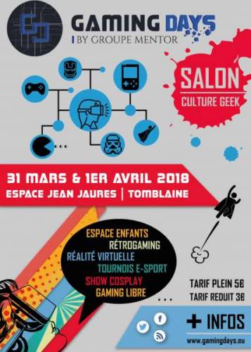 L’événement Gaming Days by Groupe Mentor est un salon autour de la culture Geek organisé les 31 mars & 1er avril à l’espace Jean Jaurès de Tomblaine. Une programmation riche en activités vous propose du rétrogaming (sur bornes d’arcades et consoles de jeux), des stands de réalité virtuelle, un show cosplay, des espaces de gaming libre et plusieurs tournois E-Sport (pré-inscription sur le site). Un espace réservé aux enfants proposera de multiples activités autour du gaming et de l’univers des super-héros.