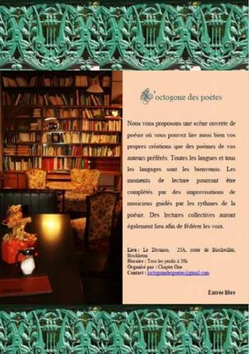 L’Octogone des poètes vous souhaite à toutes et à tous une superbe année 2018, et vous convie au Divanoo, ce jeudi 25 janvier, à partir de 20 heures, pour une nouvelle scène ouverte.