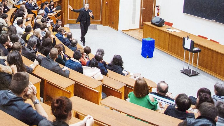 Espiègle, hilarant, le personnage de conférencier, interprété par Pierre Mifsud, semble avoir créé une machine folle dont le savoir s’écoule en flots continus. Peu désireux d’ordonner son savoir pour le penser, il est complètement accaparé par son étonnement et par le désir de le partager. Et l’on se prend à s’embarquer avec lui dans ce torrent de connaissances, pour le simple bonheur de s’immerger dans ce magma encyclopédique.