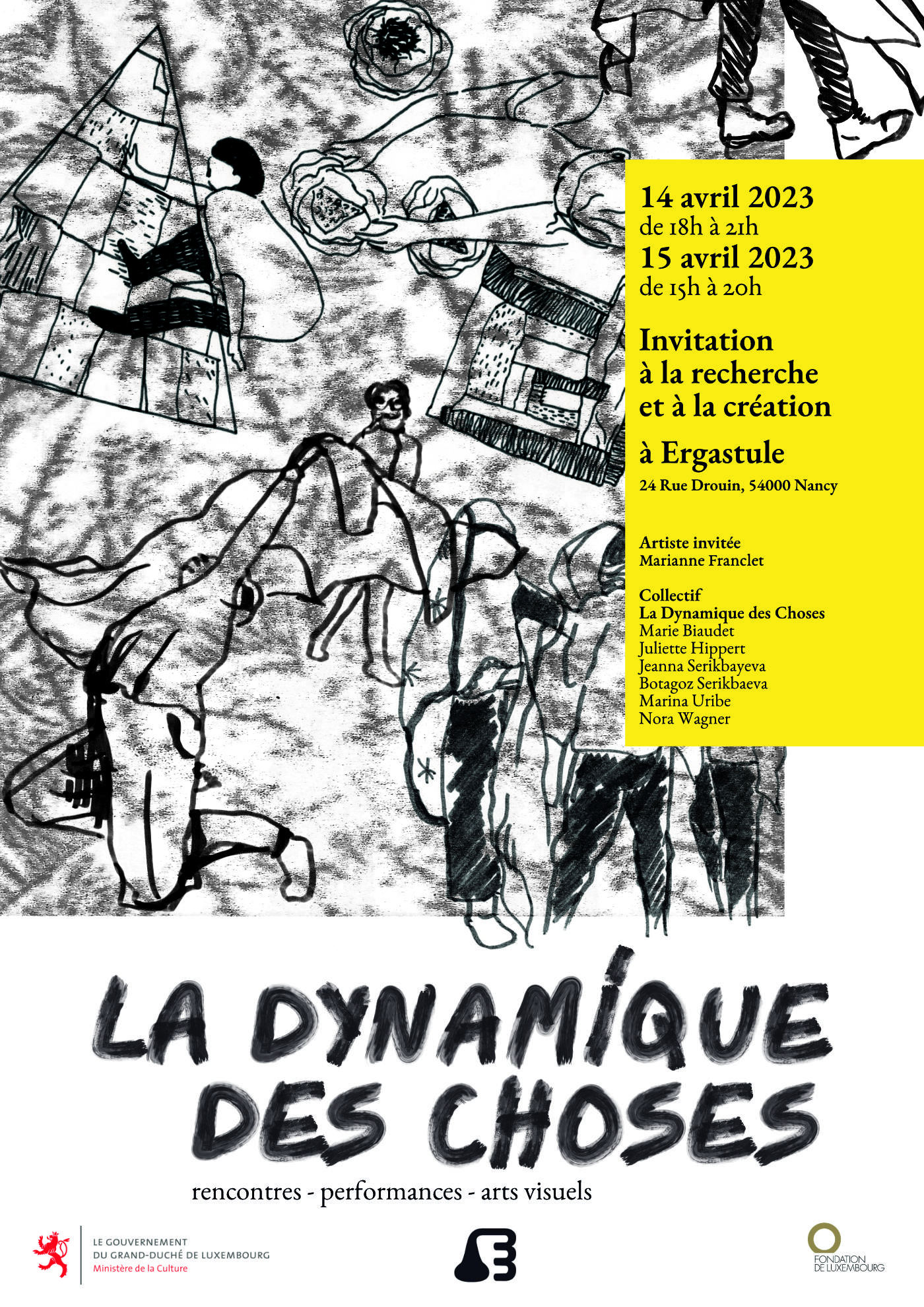 Le collectif « La dynamique des choses » est composé de six femmes de générations, d’expériences et de cultures différentes : Marie Biaudet (Fr), Botagoz Serikbaeva (Lu), Jeanna Serikbayeva (Lu), Juliette Hippert (Fr), Marina Uribe (Fr) et Nora Wagner (Lu). Les pratiques du collectif sont multiples : l'installation, la performance, la sculpture textile, la danse, la tapisserie, la céramique et le dessin ;