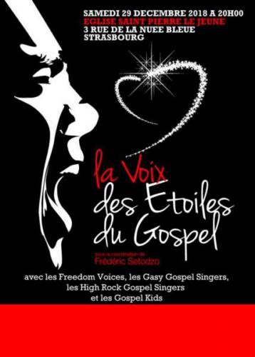 Le 29 décembre 2018 à l’Eglise Saint-Pierre le Jeune (3 rue de la Nuée Bleue à Strasbourg) aura lieu la quinzième édition de la Voix des Etoiles du Gospel. Toujours le même concept : ce concert exceptionnel réunit les groupes initiés par Frédéric Setodzo: Les Freedom Voices, les High Rock Gospel Singers et les Gospel Kids pour un grand moment de partage et de fraternité. Cette année, nous invitons les Gasy Gospel Singers.