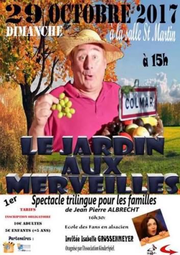 ’Le jardin aux merveilles’ est un spectacle bilingue (français-alsacien) alliant le récit, la chanson, la musique, le théâtre, les marottes et les marionnettes.