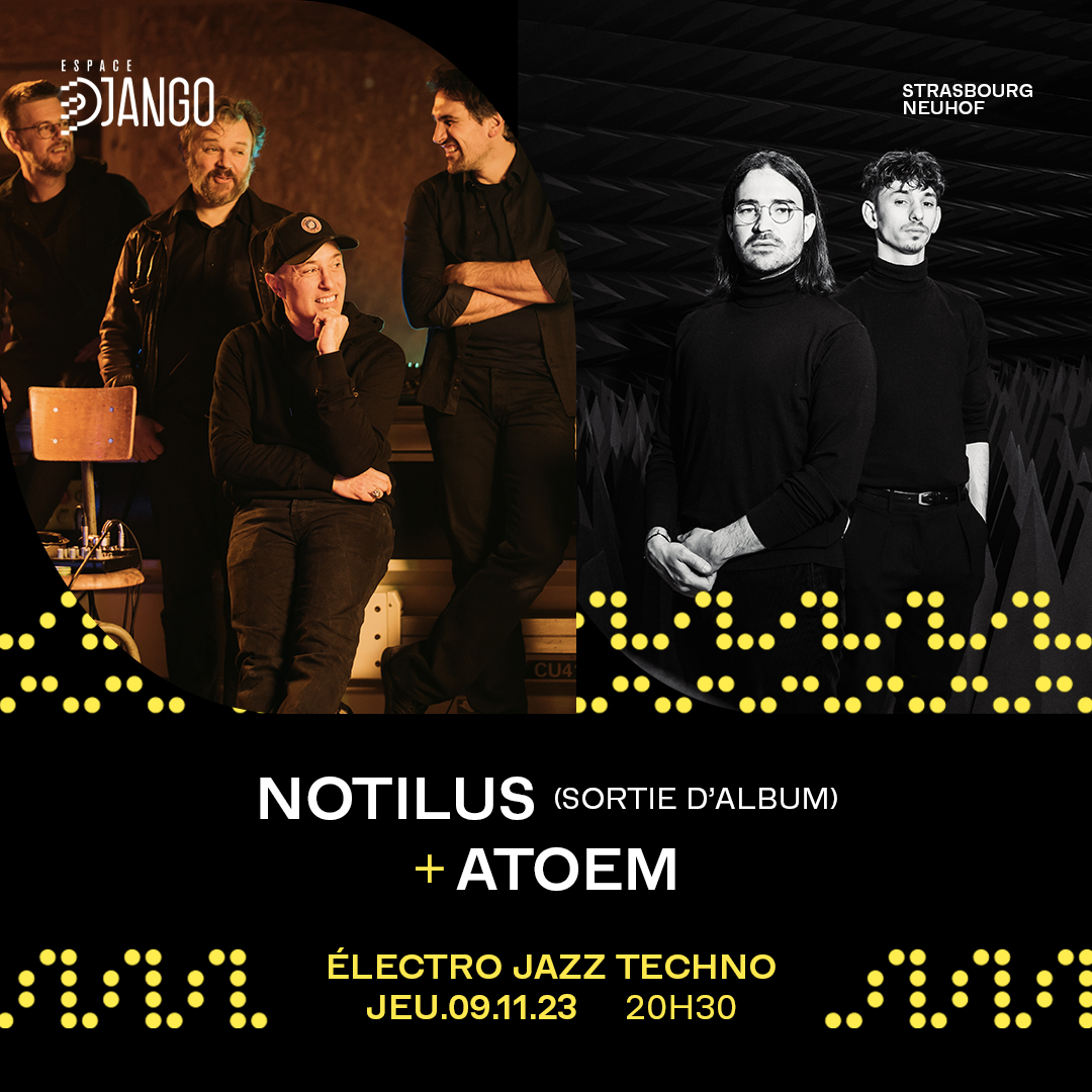 Entre jazz, ambient et techno, le quintet Notilus revient avec un nouvel album sur le précieux label allemand Denovali. Après une semaine de résidence intense à Django, ils seront fin prêts à vous présenter une expérience scénique plus organique, plus brute et plus libre que jamais ! Laissez-vous enlacer par de longues plages dansantes, aussi propices à l’introspection qu’à l’exutoire. Mais pas de sortie d’album sans fête mémorable ! ATOEM complète donc la soirée, un duo qui délivre un live calibré, face à face, entouré de ses multiples machines. Autant de prothèses électroniques dont le roi est un synthétiseur modulaire d’un mètre sur un mètre, délivrant des boucles semi-aléatoires, laissant une partie de ces musiques au hasard. Une soirée qui va vous changer les idées, pour de vrai !