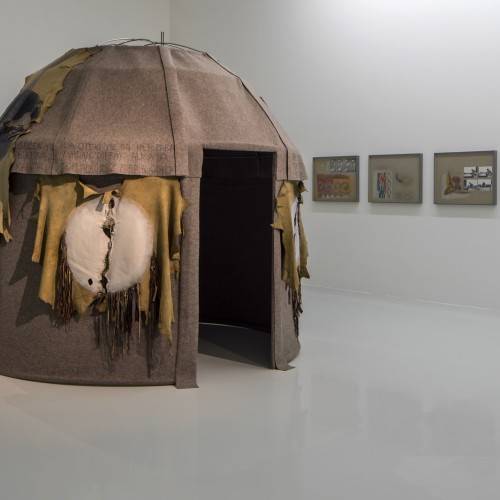 L’œuvre picturale et abstraite qui caractérise ses débuts opère un tournant « documentaire » dans les années 1970 : s’y mêlent alors des considérations sociales, anthropologiques et ethnographiques liées à son pays d’origine (comme l’artisanat, le chamanisme, la magie) en les associant aux enjeux idéologiques marquant l’après 1968. Pour cette exposition, l’artiste a choisi de présenter un ensemble d’œuvres traitant de la question du nomadisme, de l’exil, de l’univers féminin clos, à l’image par exemple de l’emblématique « Topak Ev » de 1973 (œuvre magistrale et historique dont la forme est empruntée aux traditions ancestrales des nomades de l’Anatolie) jusqu’à une production néon de 2015 : « Exile is a Hard Job ».