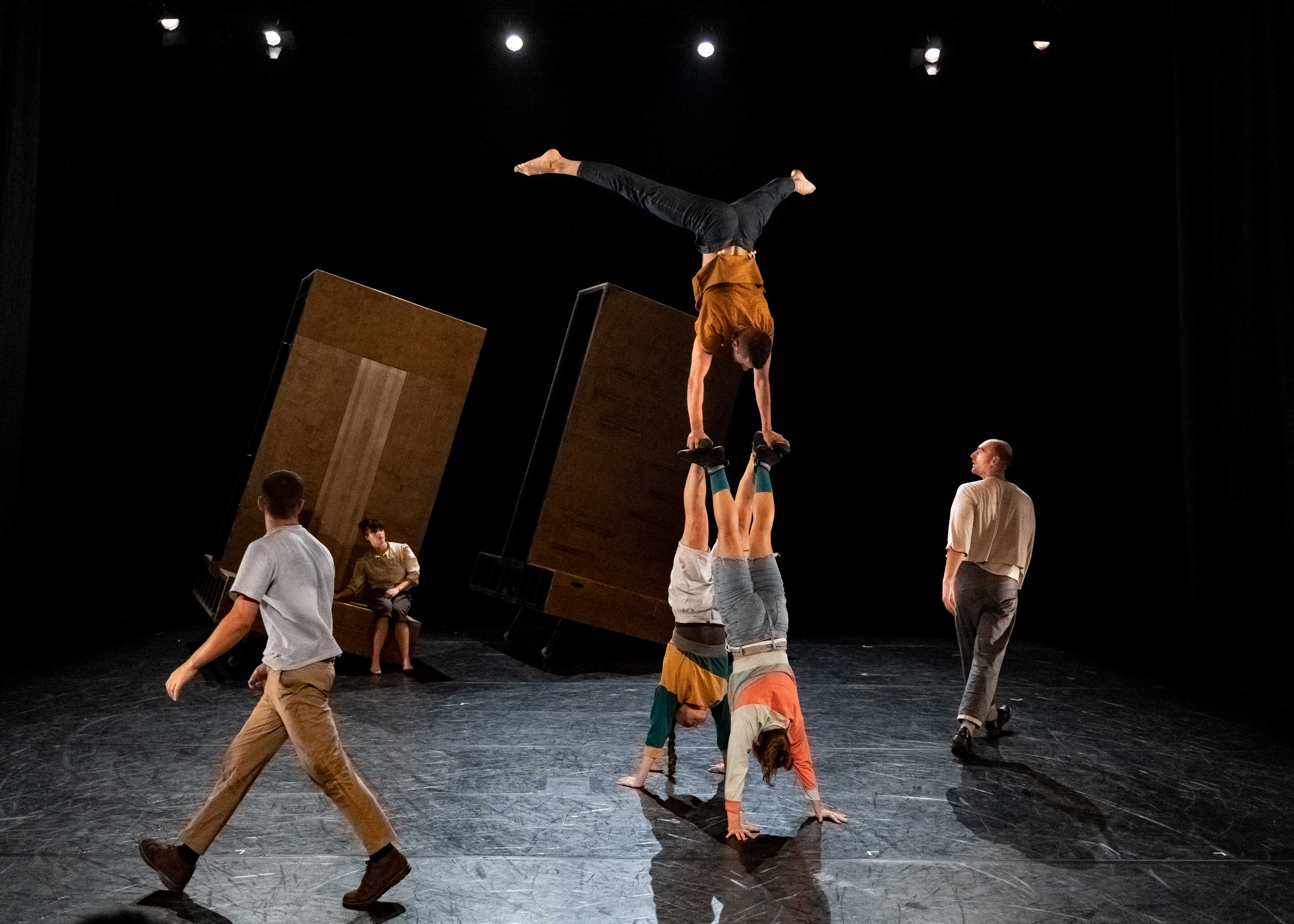 Se connecter à l’autre, se toucher, se serrer la main, se prendre dans les bras, partager... Sur scène, six acrobates présentent main à main, exercices de voltige et portés acrobatiques. Équilibre et confiance, dualité, séparations et conflits...