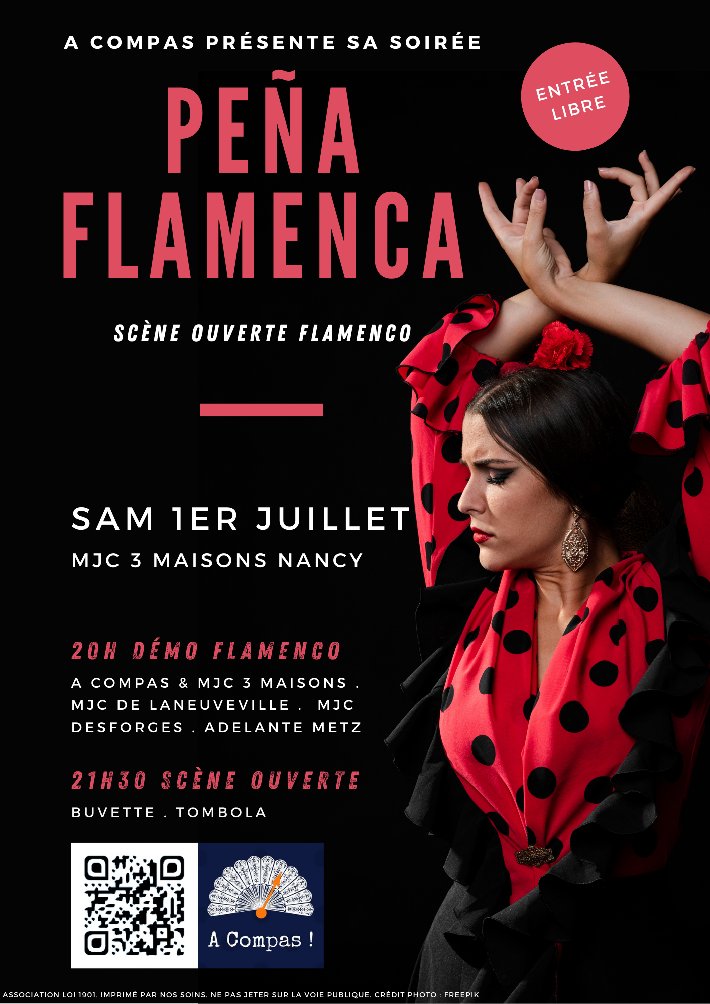 • Dès 20h, Démo des écoles de Flamenco : A Compas invite les écoles de la région à présenter pour une démo exceptionnelle d'1h30 ! Vous aurez le plaisir de découvrir les chorégraphies des écoles A Compas (Nancy et Laneuveville), MJC Desforges (Nancy) et Adelante (Metz).