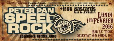 L’association Cheeky Cherry vous attend nombreux pour un évènement inratable : PETER PAN SPEEDROCK après 20 ans de bruyant, de méchant, de rapide et de grossier Rock’n’roll préparent leur tournée d’adieu. En 2016 ils démarreront les derniers concerts de leur carrière et passeront forcement par le Tigre le lundi 01 février ! Peter Pan Speedrock c’est du Motörhead version punk rock... Une débauche énorme d’énergie, des titres qui s’enchaînent sans arrêt. Un jeu de scène comme on en voit peu : ça bouge, ça transpire, ça sent la graisse de motos et surtout ça entraîne le public dans une transe incontrôlable. Et en première partie les IRON BASTARDS enverront les décibels et toute leur énergie pour vous mettre en appétit. Les fans de tout genre de Rock’n’roll vont être comblés à coup sûr !