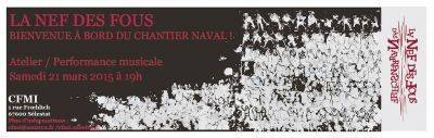 Choix de récitatifs et de chœurs, haïku, parades instrumentales, diffusion de pièces électroacoustiques et vidéos. Intervention de Laurent Naas, responsable de la Bibliothèque Humaniste de Sélestat et de Mathias Schillmöller, metteur en scène et concepteur du projet : présentation du projet et des grandes lignes des œuvres de Sebastian Brant et d’Erasme de Rotterdam (L’Éloge de la Folie et La Nef des Fous).