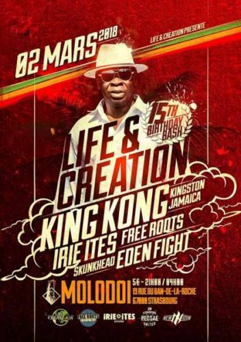 Pour notre birthday, nous avons l’honneur d’accueillir Le big bad vétéran KING KONG, qui présentera son nouvel album produit par IRIE ITES, également à l’affiche, ainsi que le friend sound d’Allemagne FREE ROOTS et deux chanteurs bien connu à Strasbourg SKUNKHEAD et EDEN FIGHT !!! Réserves ta soirée du 02 mars et viens faire la fete avec nous !!!