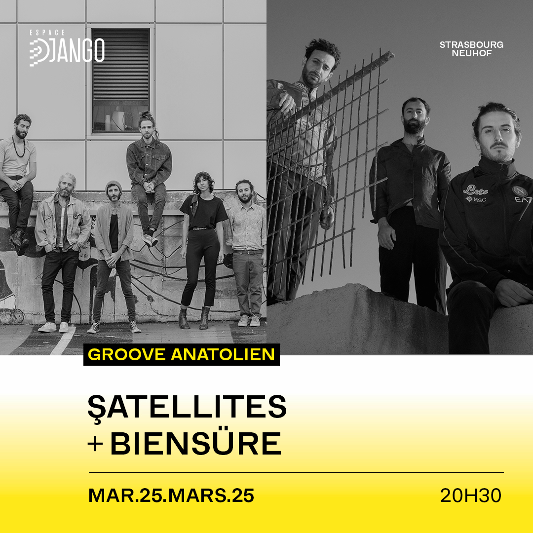 Les années 70 sous le soleil d’Istanbul sont une source d’inspiration inépuisable tant cet âge d’or folklorique et psychédélique fut prolifique. Les six membres de Satellites s’imprègnent de cette culture anatolienne dans un tourbillon de folk turc traditionnel, de guitares psychédéliques éthérées et des lignes de basses groovy calibrées pour le dancefloor. Bien sûr, cette soirée sera également disco avec un trio brillant comme une boule à facettes. Sur fond d’exil et de mixité, la rencontre humaine des trois compères de BIENSÜRE se traduit en musique ou plutôt en électro disco psychédélique. Chaussez vous bien, ça va danser, promis.