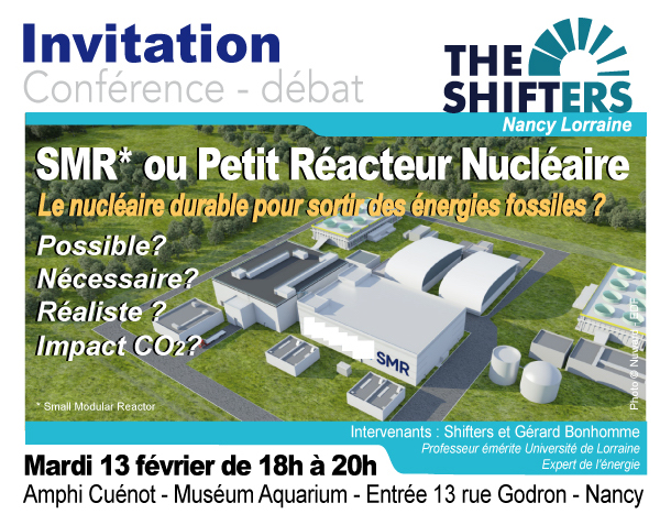Les Shifters vous invitent à la conférence « SMR et nouveau Nucléaire Durable » le jeudi 13 février à 18h à Nancy avec Gérard BONHOMME Professeur émérite de l’Université de Lorraine et expert de l’énergie