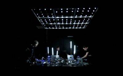 Arrays est une machine que l’on pilote à trois. Un dialogue musical en forme de face à face s’engage entre les deux musiciens pendant que le troisième pétrit le video lighting pixel par pixel. Progressivement, entre beauté et rudesse, on renonce à l’incertitude, aux doutes et aux questionnements que notre présence dans l’univers analogique a toujours suscité en nous. Progressivement, nous nous livrons, âme puis corps, au manichéisme et à l’efficience brutale de la Machine. Est-ce parce que notre humanité nous est insupportable que nous tendons inexorablement à fusionner avec le dispositif ?