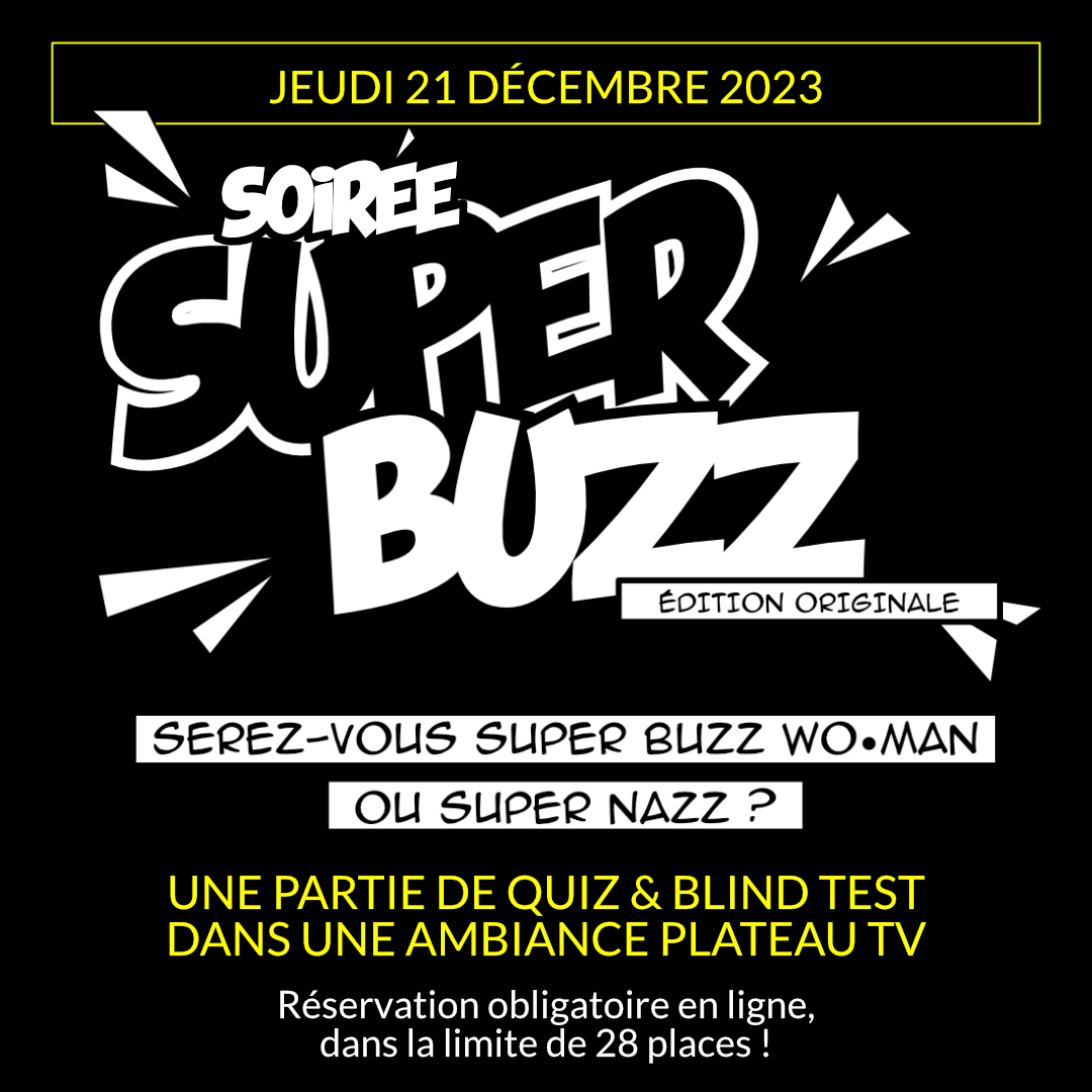 Super Buzz c'est 4 équipes qui s'affrontent sur 5 manches, en buzzant le plus vite possible pour répondre aux questions du présentateur, dans l'espoir d'amasser le plus de points. Mais attention à ne pas croire la victoire trop facile... Gagner ou perdre une manche a des conséquences ! Le jeu commence à 20h, accueil entre 19h et 19h45. Merci de venir en avance pour commencer les festivités gustatives avant la partie, car votre ticket d'entrée comprend également une boisson de bienvenue (pintes et bouteilles de Desperados non inclues) . Pour manger sur place vous pouvez commander : Hot-Dog, Saucissons, Bonbons, Bretzel, et Chips.