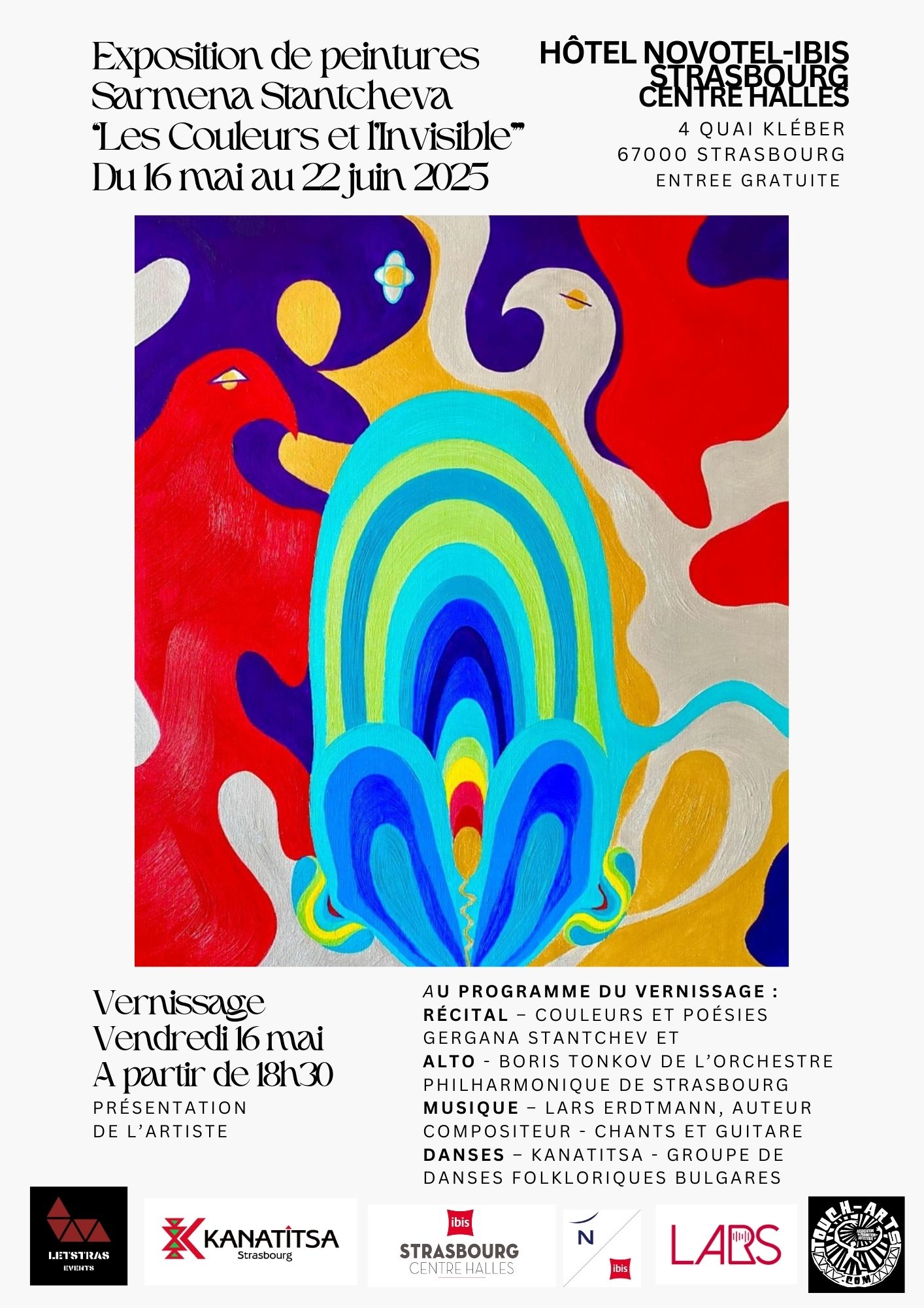 Le vernissage est bien plus qu'un simple moment d'inauguration : c'est une véritable rencontre entre artistes, une Soirée de Partage et de Découvertes. En plus de découvrir les œuvres et d’échanger avec l’artiste, vous pourrez découvrir un récital « Couleurs et Poésies » de Gergana Stantchev, poète, accompagnée par l’alto de Boris Tonkov de l’Orchestre Philharmonique de Strasbourg. En suivra un concert chant et guitare de Lars Erdtmann, auteur-compositeur et c’est le groupe de danses folkloriques bulgares Kanatitsa, qui clôturera le vernissage.