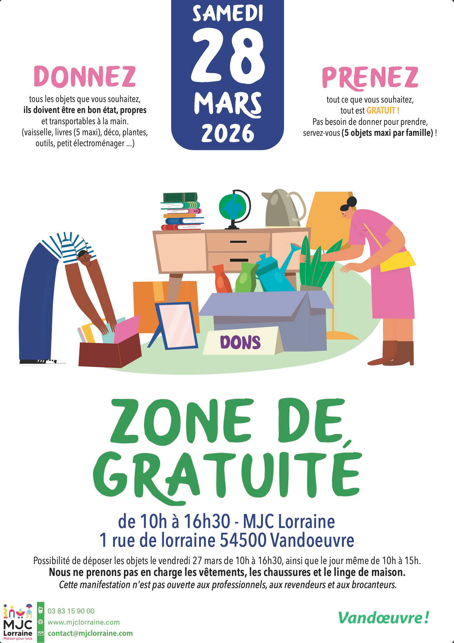 Vous avez la possibilité de déposer les objets à la MJC Lorraine le vendredi 27 mars de 10h à 16h30, ainsi que le jour même de 10h à 15h.