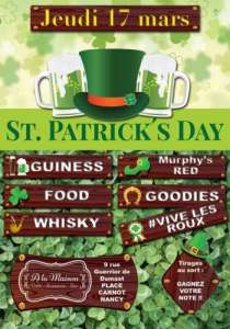 Bonne nouvelle les amis, Le bar A.L.M vous organise une grande soirée pour la St Patrick. Pour l’occasion nous nous mettons aux couleurs de l’Irlande, de nombreux goodies sont à gagner afin de faire de vous de vrais lutins verts. Et comment se passer de GUINESS & de MURPHY’S RED ?! Deux bières irlandaises et à la pression bien sûr ! Et enfin pour rester dans la tradition, un Whisky Jameson édition spéciale St Patrick ainsi que des assiettes de charcuterie seront présentent pour vous rassasier.