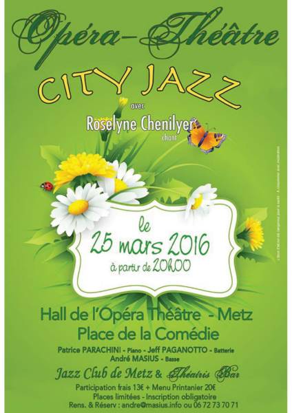 • Participation aux frais de l’association 13€ par personne. Chèque de réservation (13€ par personne) à l’ordre du Jazz Club de Metz, 10 places St Louis 57000 METZ. Veuillez préciser Menu Printanier Boeuf ou Saumon ainsi que vos coordonnées tél/email.