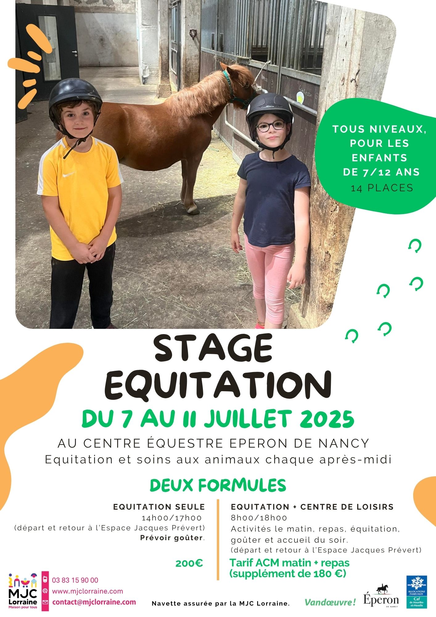 La MJC Lorraine propose un stage équitation pour les enfants de 7 à 12 ans, tous niveaux confondus, en partenariat avec le centre équestre Éperon de Nancy.