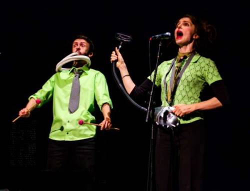 Ils sont accompagnés par un joyeux attirail d’objets en guise d’instruments dans une mise en scène tonique et précise.