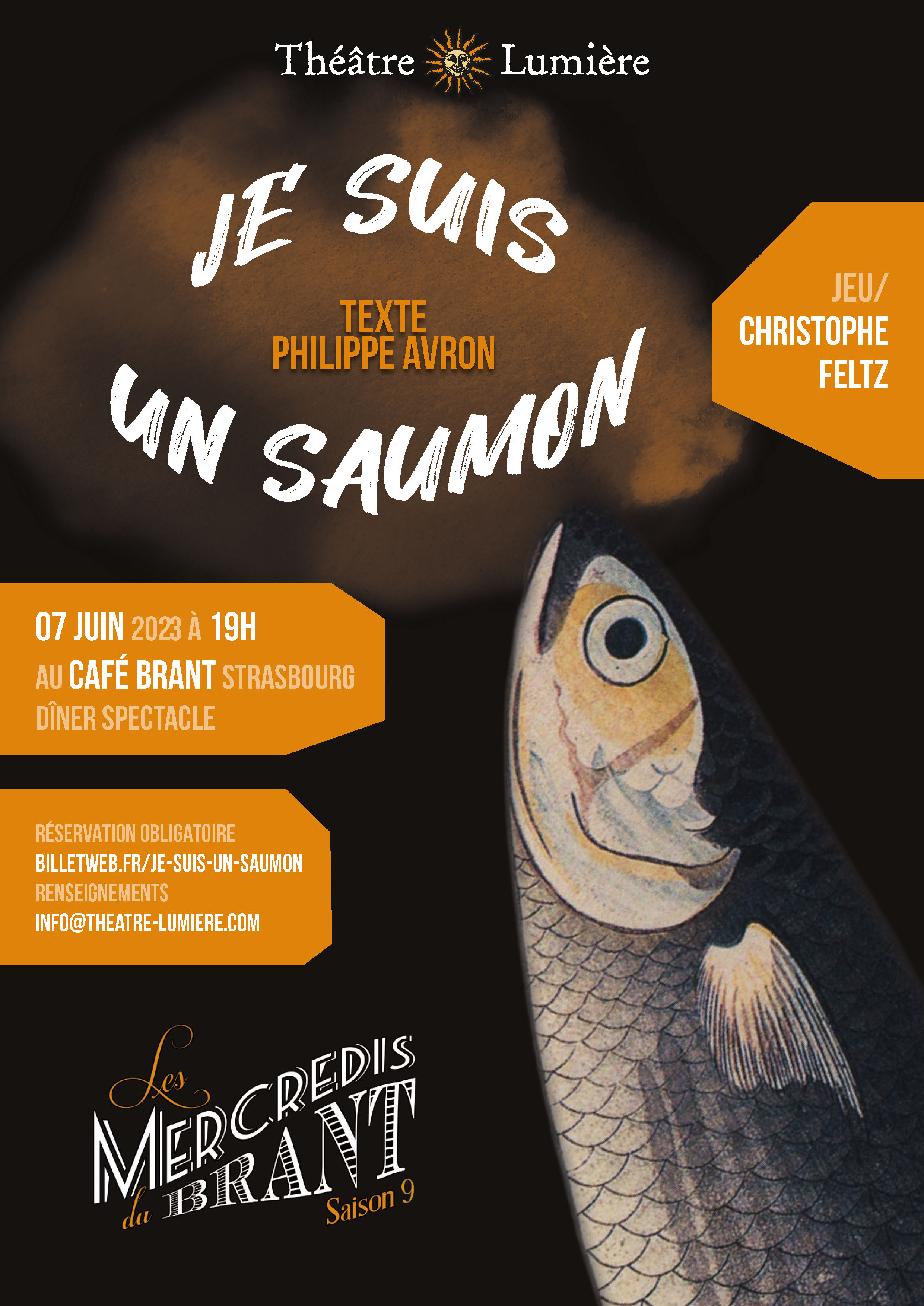 Dîner-spectacle de théâtre d’humour « Je suis un Saumon » de Philippe AvronMolière du meilleur one man show, avec le comédien Christophe Feltz le mercredi 07 juin 2023 à 19h au Café Brant à Strasbourg.