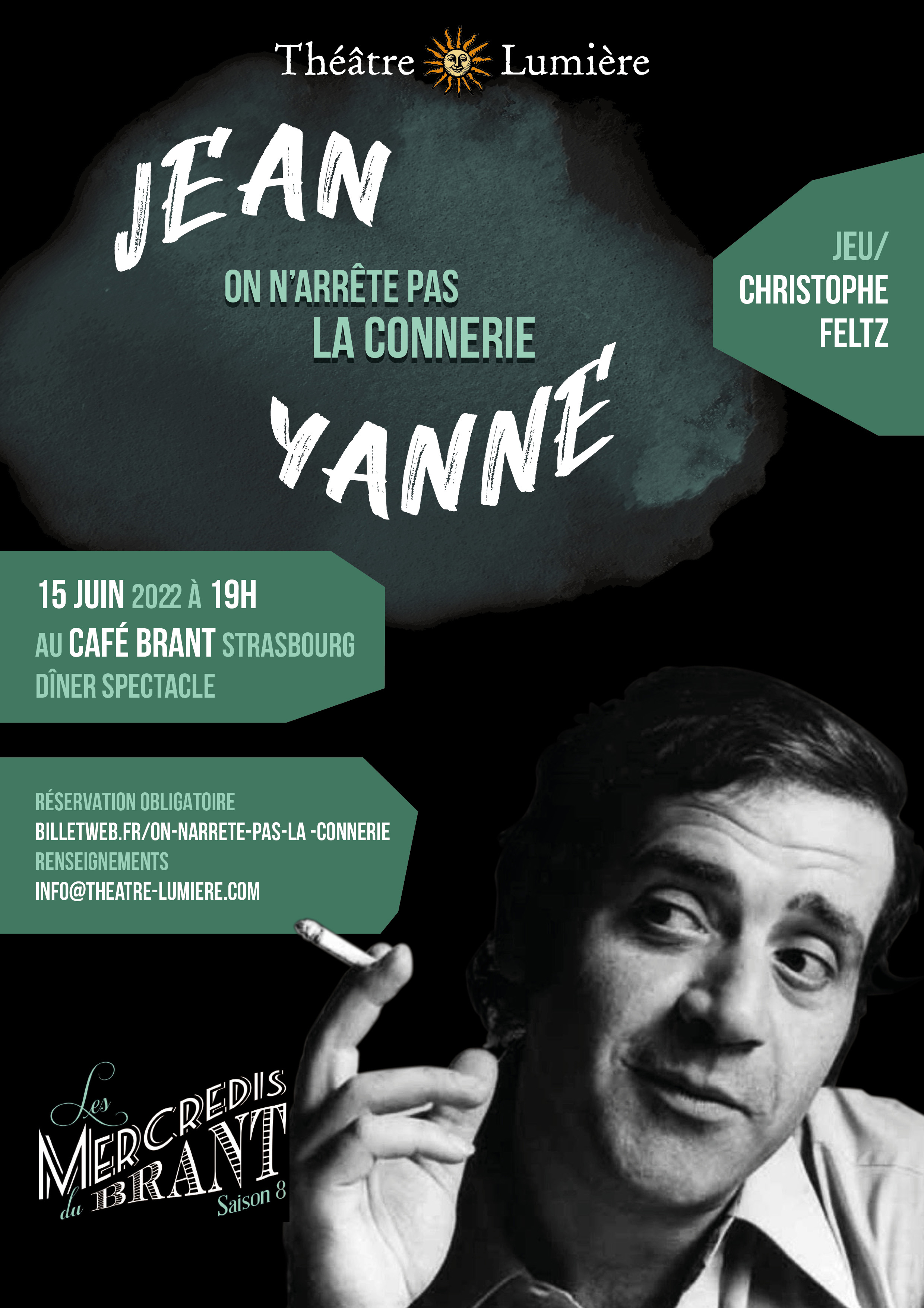 Dîner-spectacle, avec le spectacle de théâtre d’humour « On n’arrête pas la Connerie » d’après Jean Yanne, avec le comédien Christophe Feltz le mercredi 15 juin 2022 à 19h au Café Brant à Strasbourg.